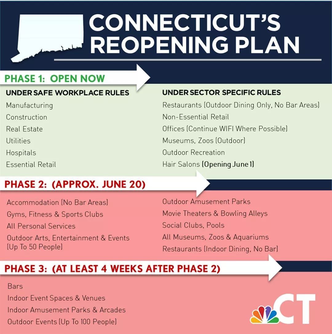 On May 20, 2020 Connecticut entered Phase I of reopening after the Covid 19 quarantine. Restaurants with outdoor dining; non-essential retail; museums and outdoor recreation were able to open if they follow specific guidelines intended to protect workers and customers. Hair salons are slated to open on June 1, 2020. Phase II of the reopening plan is schedule to begin on June 20 provided that the rates of Covid related infection and hospitalizations do not spike between now and then. Phase II includes bars, indoor activities and outdoor gatherings of up to 100 people. Phase III would begin 4 weeks after Phase II. Below is a graphic detailing the planned reopening phases. More information can be found at CT.gov/coronavirus